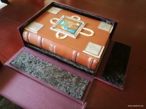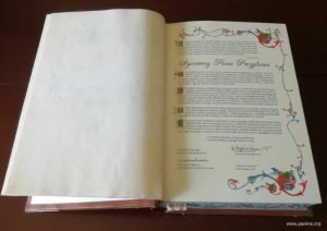 Colocamos, na Bíblia do Jubileu, uma dedicatória especial. Eis alguns fragmentos. “Conscientes do dever de cultivar a herança dos Pais, sem a qual uma nação não tem identidade, queremos homenagear o Senhor Presidente com a Bíblia do Jubileu, recordação comemorativa do 1050º aniversário de batismo da Polônia e dos 100 anos da independência polonesa. Fazemos isso como filhos da nação polonesa e, ao mesmo tempo, como herança do carisma oferecido à Igreja pelo Bem-aventurado Tiago Alberione, fundador da Família Paulina”.