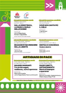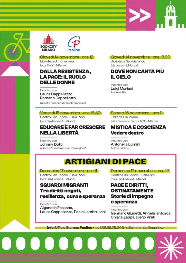 As livrarias Paulinas como sempre, estiveram presentes em vários eventos em Milão (e não só), com uma particular atenção ao foco temático “Guerra e Paz”. Além das diversas apresentações de livros, neste ano foi planejado também um ciclo de encontros compartilhados com outras editoras católicas na Sala Ricci da Fundação San Fedele. A iniciativa Artesãos da Paz contou com a colaboração da Arquidiocese de Milão.