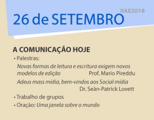 A comunicação hoje Palestras: • Novas formas de leitura e escritura exigem novos modelos de edição Prof. Mário Pireddu, docente na Universidade de Roma3, na Libera Università degli Studi della Tuscia e na Universidade de Viterbo • Adeus mass mídia, bem-vindos aos Social mídia Dr. Seàn-Patrick Lovett, jornalista e diretor da programação, em inglês,… Ler mais »