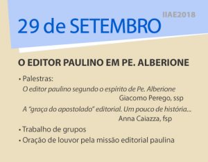 O Editor paulino em Pe. Alberione Palestras: • O editor paulino segundo o espírito de Pe. Alberione Giacomo Perego, ssp • A “graça do apostolado” editorial. Um pouco de história… Anna Caiazza, fsp Trabalhos de grupo Oração de louvor pela missão editorial paulina