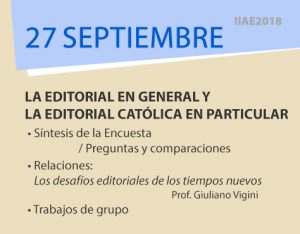 La editorial en general y la editorial católica en particular • Síntesis de la Encuesta / Preguntas y comparaciones • Relación: Los desafíos editoriales de los tiempos nuevos Prof. Giuliano Vigini, ensayista y docente de sociología de editoría contemporánea en la Universidad Católica del Sacro Cuore de Milán • Trabajos de grupo