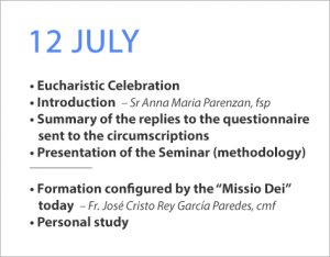 • Eucharistic Celebration • Introduction – Sr Anna Maria Parenzan, fsp • Summary of the replies to the questionnaire sent to the circumscriptions • Presentation of the Seminar (methodology) _________ • Formation configured by the “Missio Dei” today – Fr. José Cristo Rey García Paredes, cmf • Personal study
