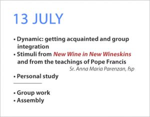 • Dynamic: getting acquainted and group integration • Stimuli from New Wine in New Wineskins and from the teachings of Pope Francis Sr. Anna Maria Parenzan, fsp • Personal study _________ • Group work • Assembly