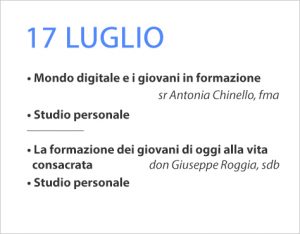 • Mondo digitale e i giovani in formazione    sr Antonia Chinello, fma • Studio personale ___________________ • La formazione dei giovani di oggi alla vita consacrata don Giuseppe Roggia, sdb • Studio personale