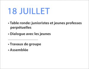 • Table ronde: junioristes et jeunes professes perpétuelles • Dialogue avec les jeunes _______________________ • Travaux de groupe • Assemblée