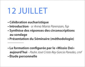 • Célébration eucharistique • Introduction – sr Anna Maria Parenzan, fsp • Synthèse des réponses des circonscriptions au sondage • Présentation du Séminaire (méthodologie) _________ • La formation configurée par le «Missio Dei» aujourd’hui – Padre José Cristo Rey García Paredes, cmf • Étude personnelle