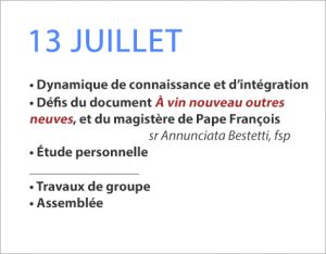• Dynamique de connaissance et d’intégration • Défis du document À vin nouveau outres neuves, et du magistère de Pape François sr Annunciata Bestetti, fsp • Étude personnelle ________________ • Travaux de groupe • Assemblée