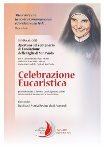 Nouvelles du Gouvernement Ouverture du Centenaire de fondation des Filles de Saint Paul Posté 1 février 2015 Le 5 février 2015, dans le 51ème anniversaire de la mort de la vénérable sœur Tecla Merlo, cofondatrice des Filles de Saint Paul, une solennelle Célébration Eucharistique ouvrira le Centenaire de fondation de l’Institut… Lire la suite »