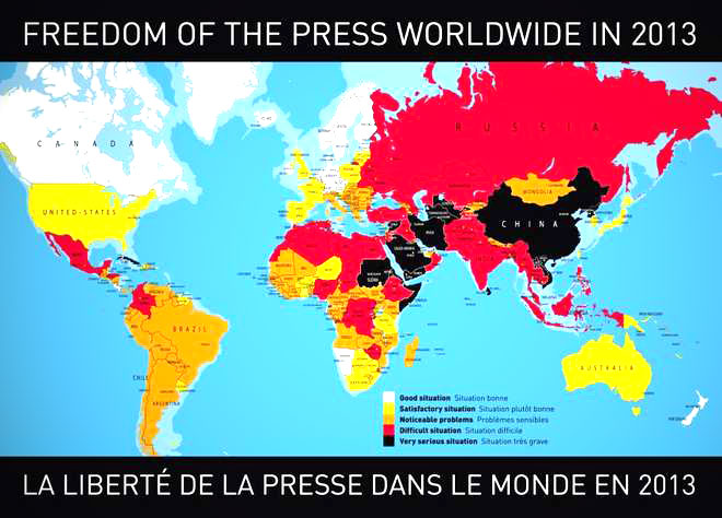 La classifica 2013 della libertà di stampa in 179 Paesi del mondo, è pubblicata nel rapporto della Ong internazionale Reporters sans frontières (Rsf). I Paesi democratici occupano i primi posti della classifica, mentre quelli dittatoriali occupano le ultime tre posizioni: Democrazie nordeuropee in testa – Norvegia, Olanda e Finlandia – dittature asiatiche in coda – Corea del nord, Turkmenistan e Eritrea.