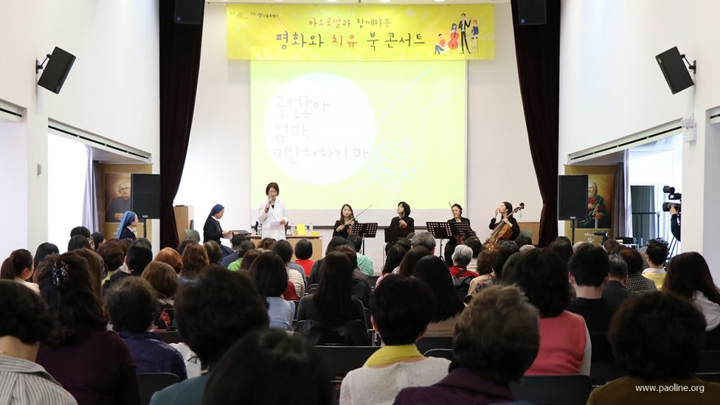 Avec l’objectif de donner gloire à Dieu et paix aux personens, les Paoline de la Corée ont programmé divers concerts pour presenter des livres sur le thème en soplidarité avec ceux qui travaillent pour le bienêtre humain. Un projet inseré dans le programme de soutien sponsorisé par la ville de Seoul. Les concerts pour le livre se tiendront quatre fois durant l’an sur les thèmes suivants: mourir bien, bonheur, dépendance, therapie du sourire.
