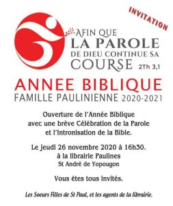 Le 26 novembre a été célébrée l’Intronisation de la Bible dans la librairie, alors que dimanche 29 novembre la Messe solennelle dans la cathédrale de Yopougon, avec grande participation de fidèles. Pour l’occasion ont été prédisposés les T-Shirt et les Polos avec le logo de l’An Biblique. L’évènement a été repris et transmit voie web.