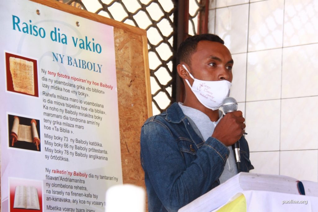Nas três cidades onde Paulinas está presente – Antananarivo, Fianarantsoa, Toamasina -, as irmãs foram às paróquias lembrando e incentivando os fiéis a terem amor à leitura e à escuta da Palavra de Deus. Em alguns programas de rádio, foram feitas leituras contínuas de textos bíblicos, a recitação da oração do Ano Bíblico e o canto do hino do Ano Bíblico, traduzido em malgaxe. “Para que a Palavra se difunda” (2Ts 3,1).