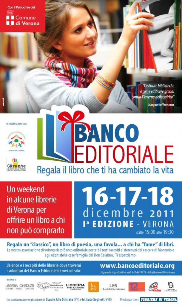 El Banco Editorial es una verdadera y propia “colecta cultural” que, a mediados de diciembre, llevará a los veroneses a 9 librerías de la ciudad para elegir y adquirir «el libro que ha cambiado su vida» y donarlo en beneficencia a favor de los detenidos de la cárcel y de los menores hospedados en las casas-familias del Instituto Don Calabria.
