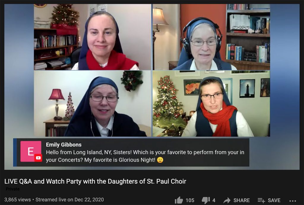Initié il y a 26 ans comme offre de chants pour les villes de New York et Boston, le Chœur des Filles de Saint Paul est de venu dans le temps un tour de Noël à travers tout le continent américain. L’an 2020 a été aussi pour notre Chœur un an sans précédents. Le concert d’itinérant s’est transformé dans un concert virtuel, impliquant toutes les sœurs de la Province qui travaillent dans les social media.