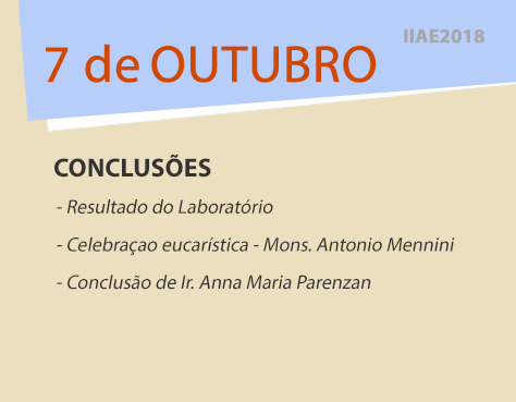 IIAE2018-programa-pt IIAE2018-7 de outubro Públicado 7 Outubro 2018 Conclusões Resultado do Laboratório Conclusão de Ir. Anna Maria Parenzan Celebraçao eucarística – Mons. Antonio Mennini