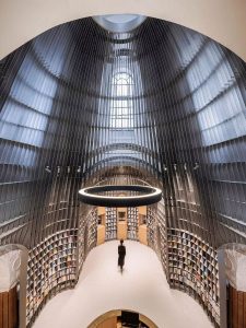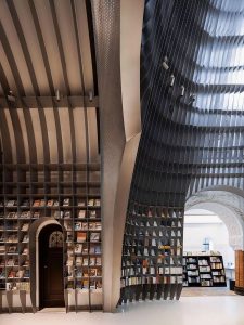 Los libros son expuestos en altos estantes construidos con 45 toneladas de acero. Una malla que sin cubrirlas, sigue las onduladas líneas de las naves. Solo en la cúpula central se encuentran 1880 títulos, incluídos 600 libros de otros países. Estos son los tesoros de una de las librerías más impresionantes del mundo.