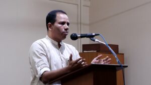 O Sr. Lawrence Coelho, editor-redator de The Secular Citizen and Divo, falou longamente sobre a importância de compreender os pensamentos e palavras dos outros. Com uma abordagem jornalística, ilustrou vários tipos de “leitura” que enriquecem o mundo literário.