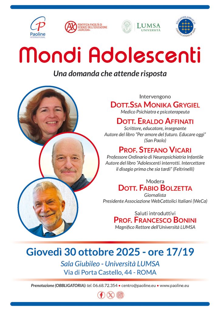 L’evento Mondi Adolescenti: una domanda che attende risposta, organizzato giovedì 30 ottobre 2025 presso l’Università LUMSA da Paoline Multimedia e dalla Pontificia Facoltà di Scienze dell’Educazione “Auxilium”, si inserisce tra gli appuntamenti del Giubileo del mondo educativo. L’incontro, condotto da Fabio Bolzetta, presidente di WECA, ha visto la partecipazione di voci autorevoli come Monika Grygiel (psicologa e psicoterapeuta), Eraldo Affinati (scrittore ed educatore) e Stefano Vicari (neuropsichiatra infantile), che hanno intrecciato psicologia, educazione e neuropsichiatria per delineare una nuova mappa di ascolto e comprensione.