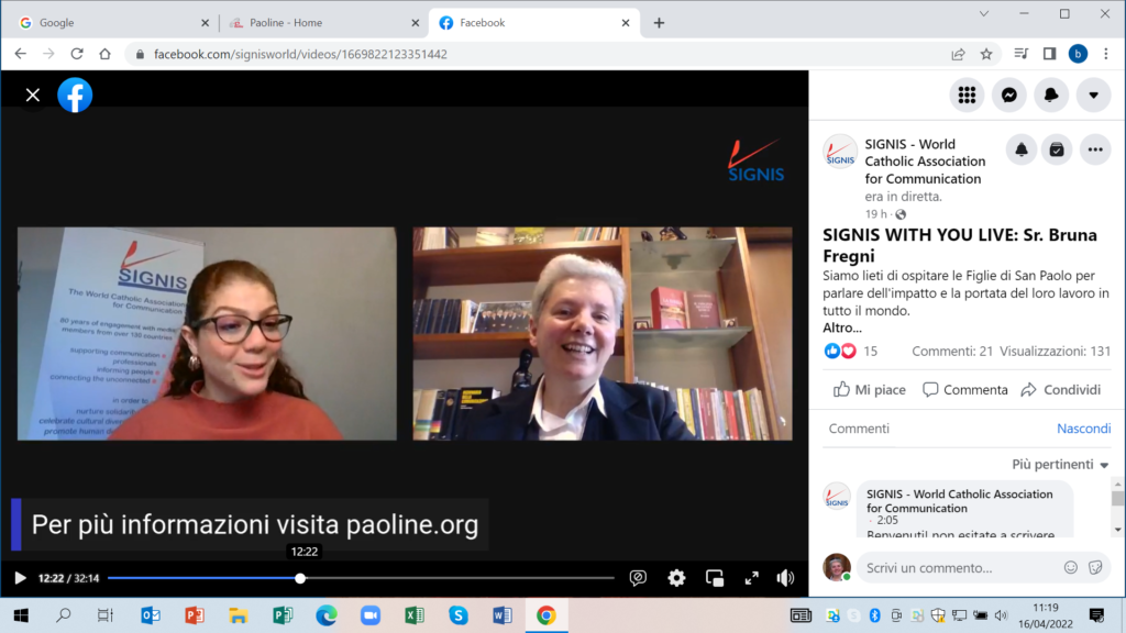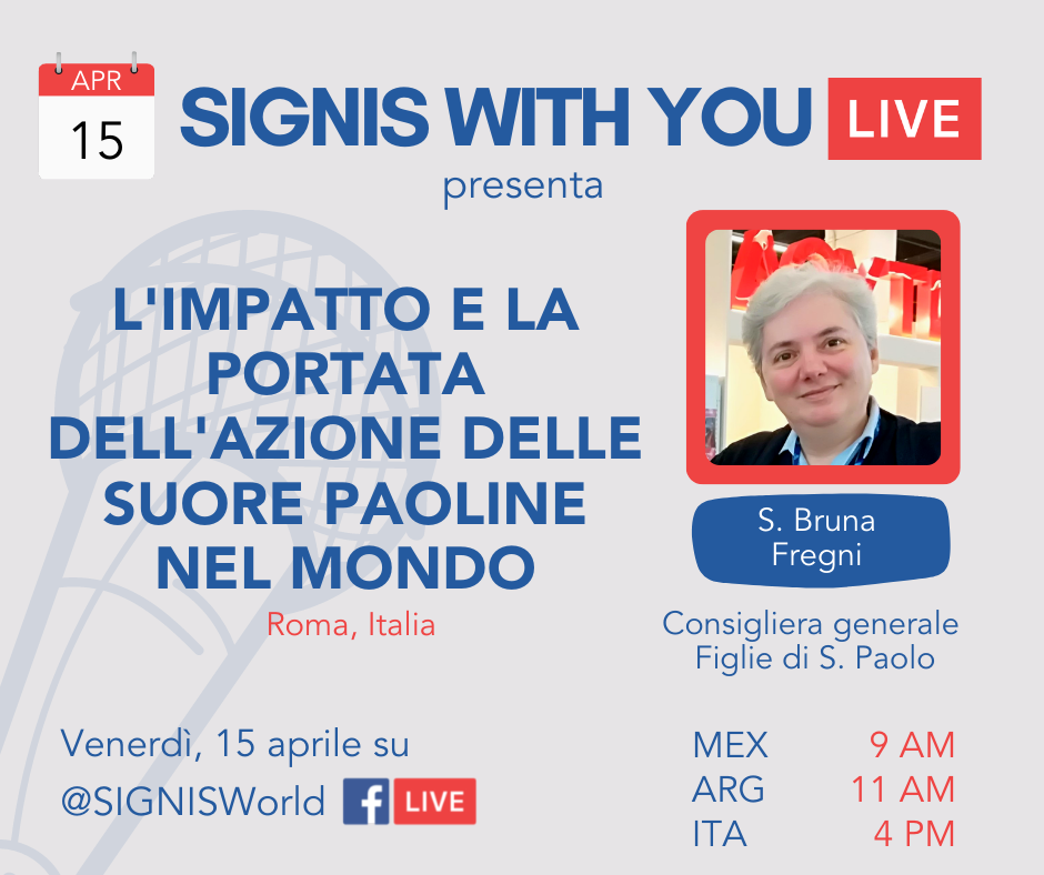 Este é o tema da entrevista com Ir. Bruna Fregni, conselheira geral das Filhas de São Paulo, realizada no dia 15 de abril de 2022 no contexto da Signis ao vivo, com uma série de encontros online na página do Facebook desta associação de comunicadores católicos presentes em todo o mundo, à qual as Paulinas estão presentes sob a denominação Paulines Communication Network.