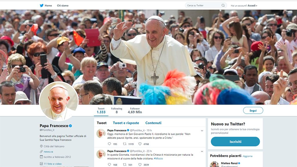 A conta oficial Twitter do papa Francisco tem mais de 40 milhões de seguidores, em 9 línguas, entre as quais também o latim. Significativo não somente pelo número, mas, sobretudo pela importância que o Pontífice, como também seu predecessor, atribui à presença de testemunhos cristãos no “Continente digital” e particularmente nas redes sociais.