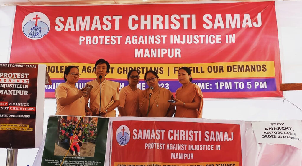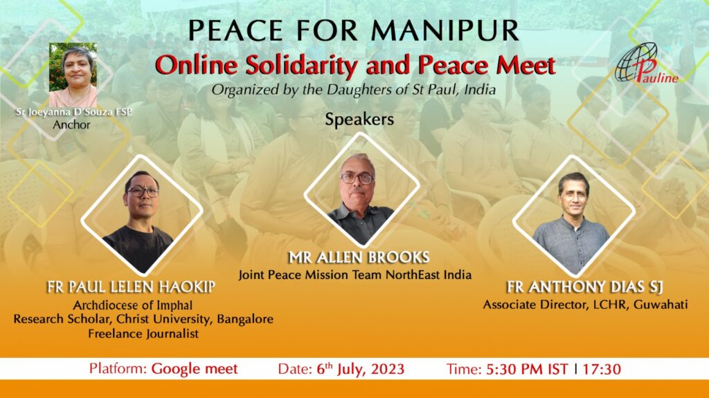 Nos sœurs étaient en mission en cette zone, quand est éclaté le conflit. En toute l’Inde, à différents niveaux, catholiques, chrétiens de toutes les dénominations, et aussi des personnes sensibles d’autres croyances ont organisé des manifestations et rencontres de paix pour protester contre le manque d’une réponse efficace à cette situation. Les Filles de Saint Paul ont organisé une rencontre de prière online pour la paix et la solidarité. Divers les participants: laïcs, religieux et clergé provenant de diverses parties de l’Inde et du monde. Trois intervenants fameux se sont engagés en des arguments qui expliquaient les retro -scènes du conflit, la coexistence entre les tribus qui s’affrontaient, offrant des possibles solutions pour faire retourner la paix en cette terre et en ce peuple.