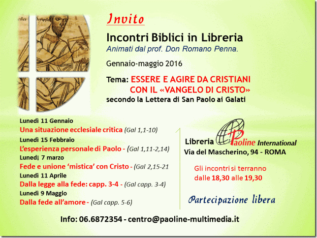 En Roma, en la librería Paoline Multimedia Internazionale de via del Mascherino, se ha dado inicio a la serie de encuentros bíblicos animados por el padre Romano Penna. El programa del tema Ser y actuar como cristianos con el Evangelio de Cristo, según la Carta de San Pablo a los Gálatas, se desarrollará con un encuentro al mes, desde enero a mayo de 2016.
