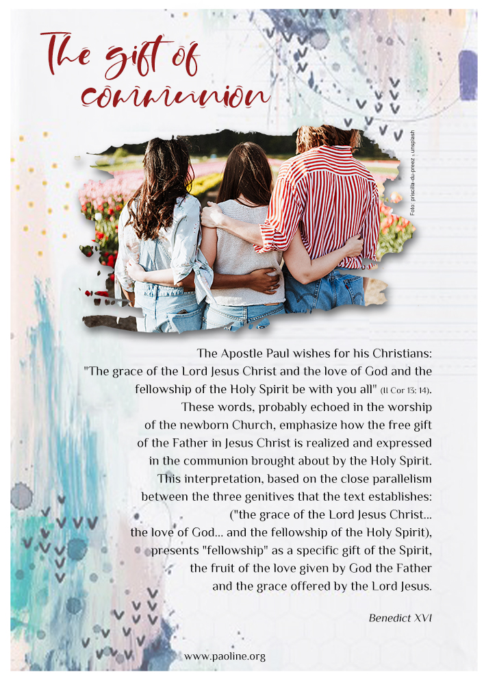 These words, probably echoed in the worship of the newborn Church, emphasize how the free gift of the Father in Jesus Christ is realized and expressed in the communion brought about by the Holy Spirit.