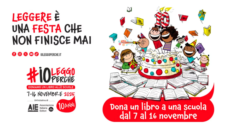 The AIE (Italian Publishers Association) initiative took place from November 7 to 16, 2025 with the intent to restock school libraries. This is the tenth year that, #ioleggoperché—the largest reading promotion initiative nationwide—has enabled school libraries to receive millions of donated copies of books.