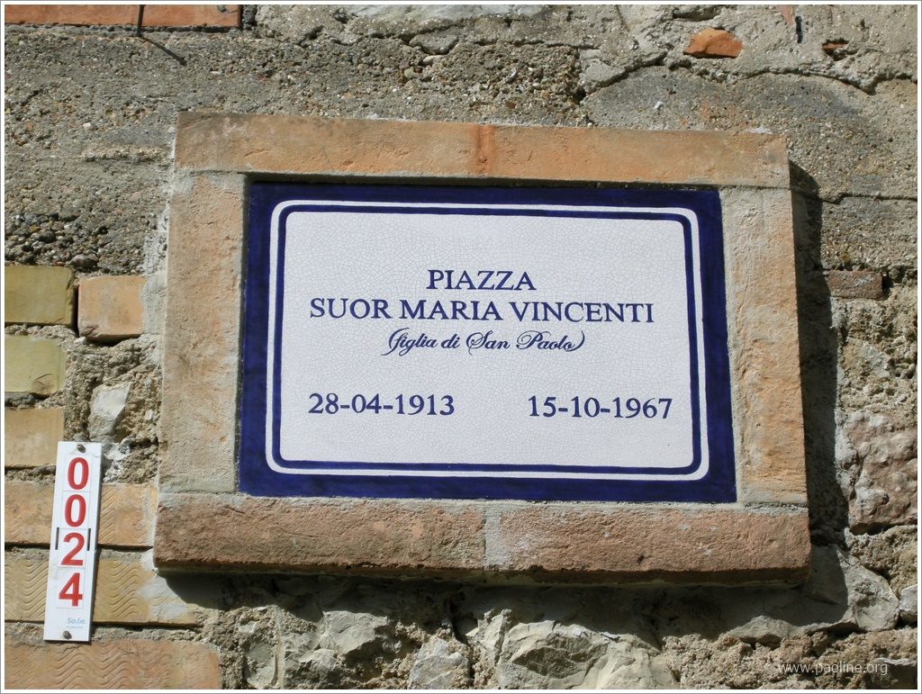 Mestra Vincenti, uma paulina de ampla visão, escritora e redatora, dotada de sensibilidade artística e senso de humor, deixa o seu nome gravado não apenas nos corações de quantos a conheceram, mas também na praça a ela dedicada. Ela era uma mulher tímida e reservada, que saindo de Santa Restituta, pequeno vilarejo da Úmbria, traçou sulcos profundos no caminho formativo e apostólico das Filhas de São Paulo.
