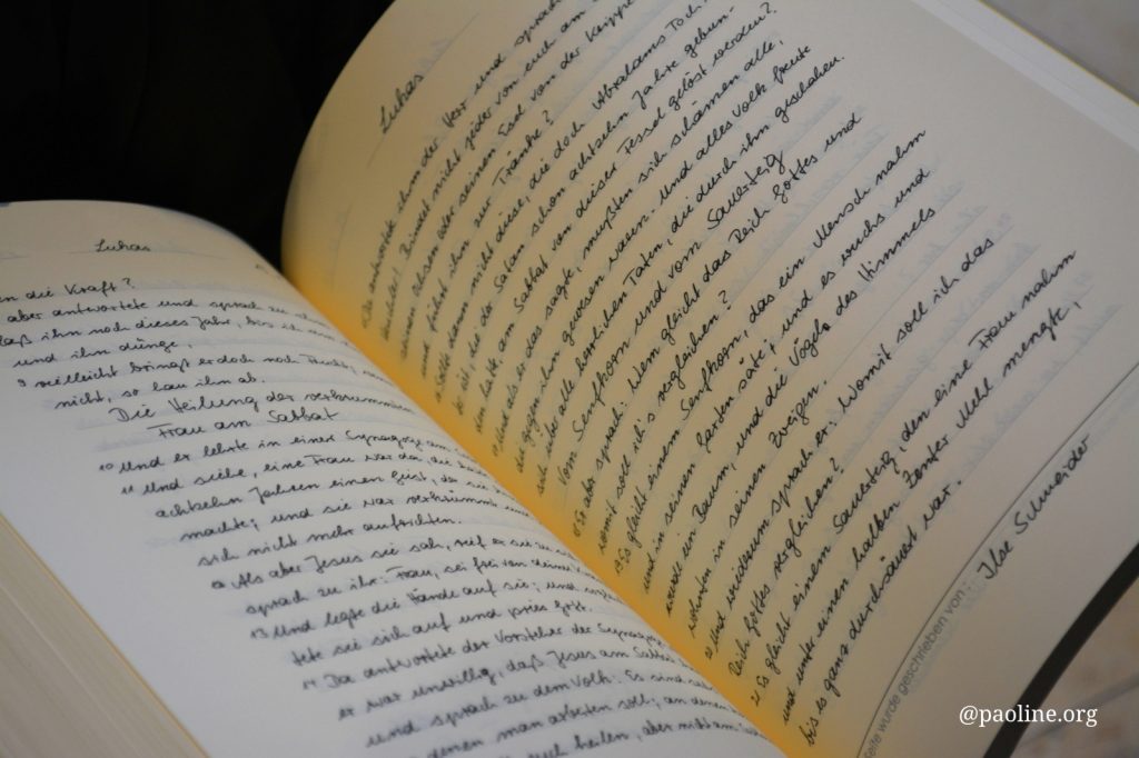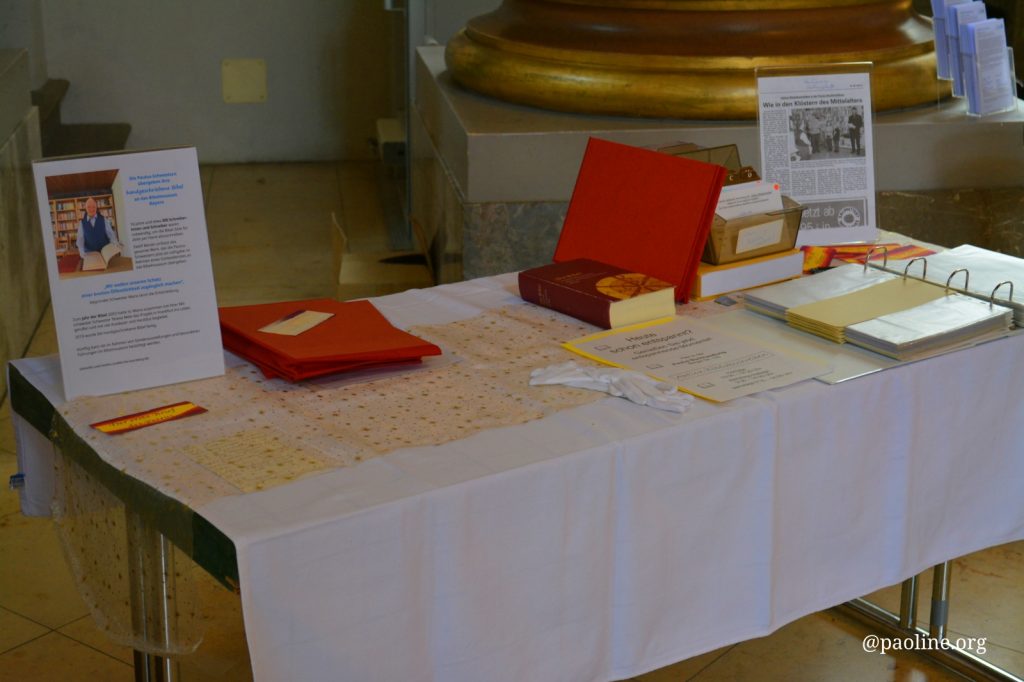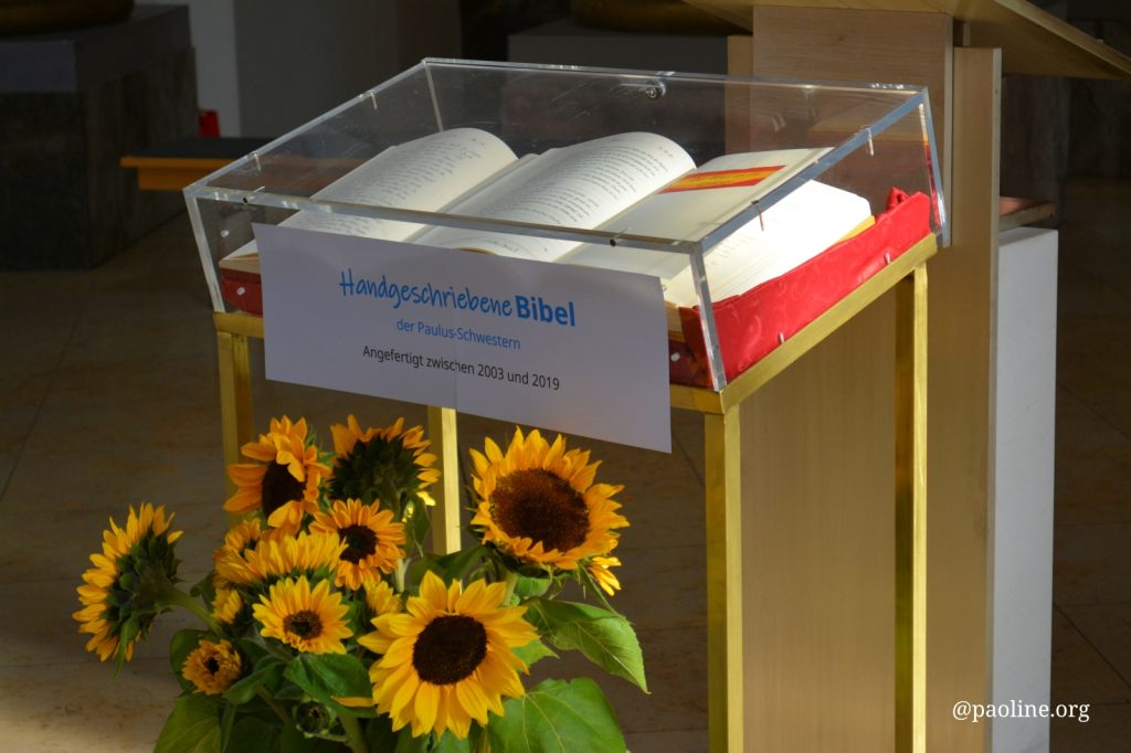 Nata nel 2003 a Francoforte durante l’Anno Biblico indetto dalle Chiese cattolica e protestante, l’iniziativa delle Figlie di San Paolo di far copiare a mano l’intera Bibbia è diventata oggi un’opera museale. Clienti della libreria, passanti, famiglie e scolaresche hanno contribuito negli anni alla trascrizione dei testi sacri.